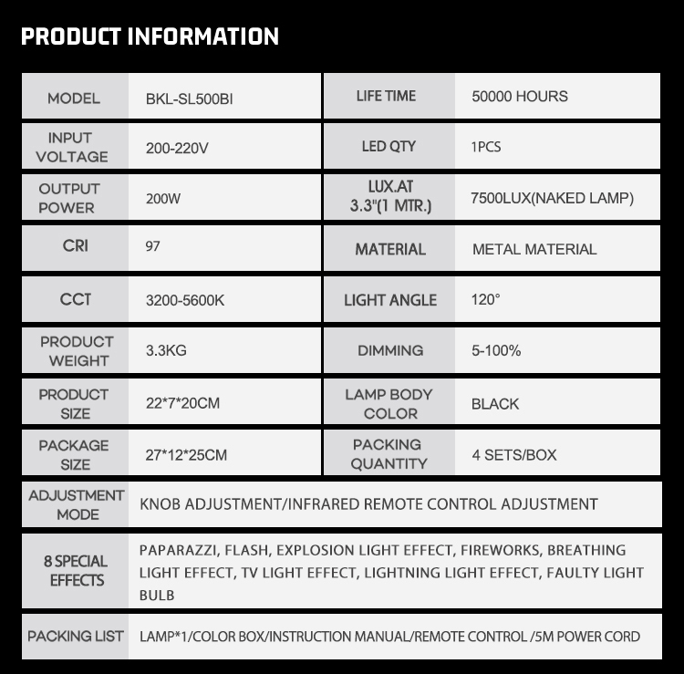 PACKING LIST:LAMP*1/COLOR BOX/INSTRUCTION MANUAL/REMOTE CONTROL/5M POWER CORD
