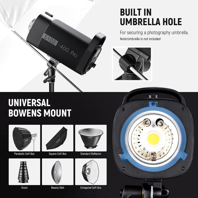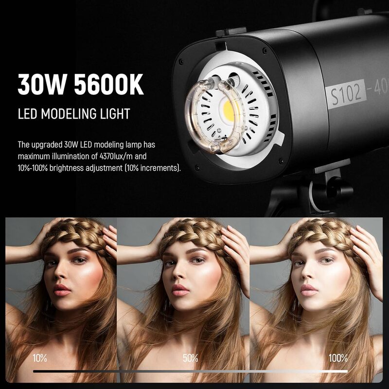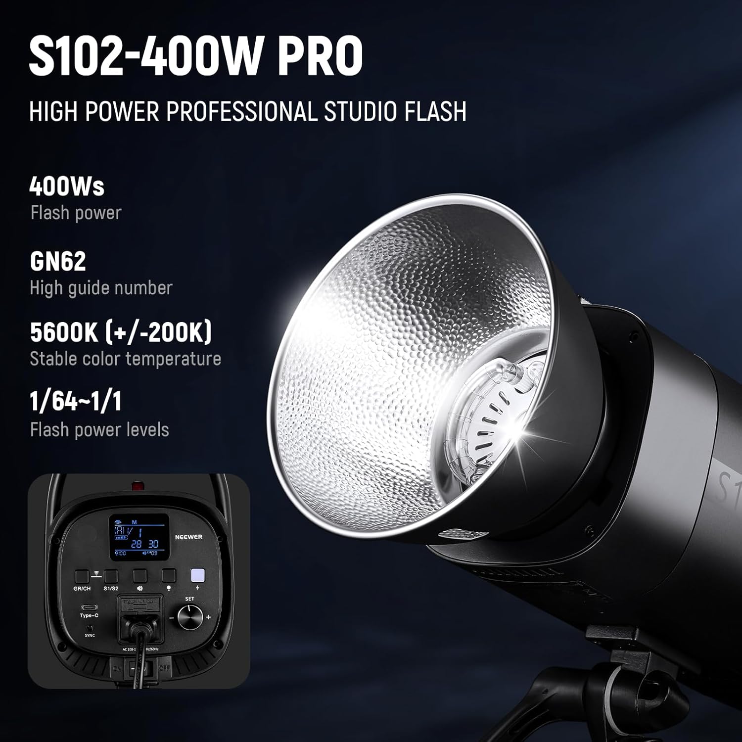 فلاش NEEWER S102-400W PRO Studio Monolight بقوة 400 واط مع مصباح نمذجة LED، يتميز بقوة إخراج عالية تبلغ 400 واط، ورقم توجيه GN62 (1 متر، ISO100)، ومصباح نمذجة LED مُحسّن (5600 كلفن، 4370 لوكس/متر) للإضاءة التجارية، والبورتريه، وحفلات الزفاف، وجلسات التصوير في الاستوديو، وتصوير الحياة الساكنة. مدة تشغيل تتراوح بين 1/100 و1/1000 ثانية، ووقت إعادة تدوير ≤1.5 ثانية لتجميد الحركات الديناميكية.