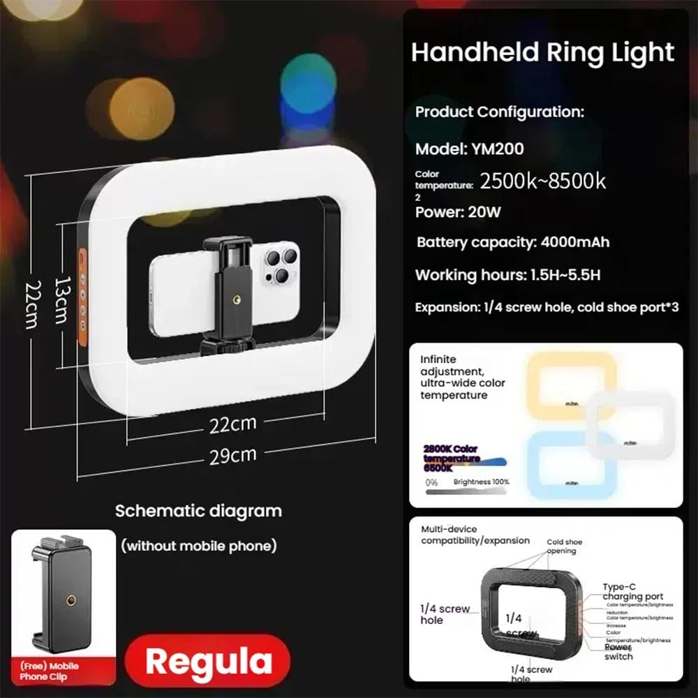 رينج لايت محمولة بتصميم عصري مثالي لتصوير الفيديوهات القصيرة والبث المباشر. توفر إضاءة ناعمة ومتوازنة لتحسين جودة الصور وإبراز ملامح الوجه بشكل طبيعي.